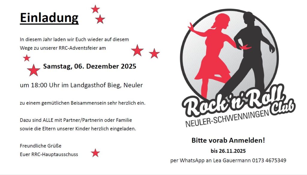 Adventsfeier + zum Google Calendar hinzufügen + zu iCal exportieren Datum 06 Dez. 2025 Uhrzeit 18:00 - 23:00 Kategorien Boogie Woogie Rock'n'Roll Social Diese Veranstaltung teilen