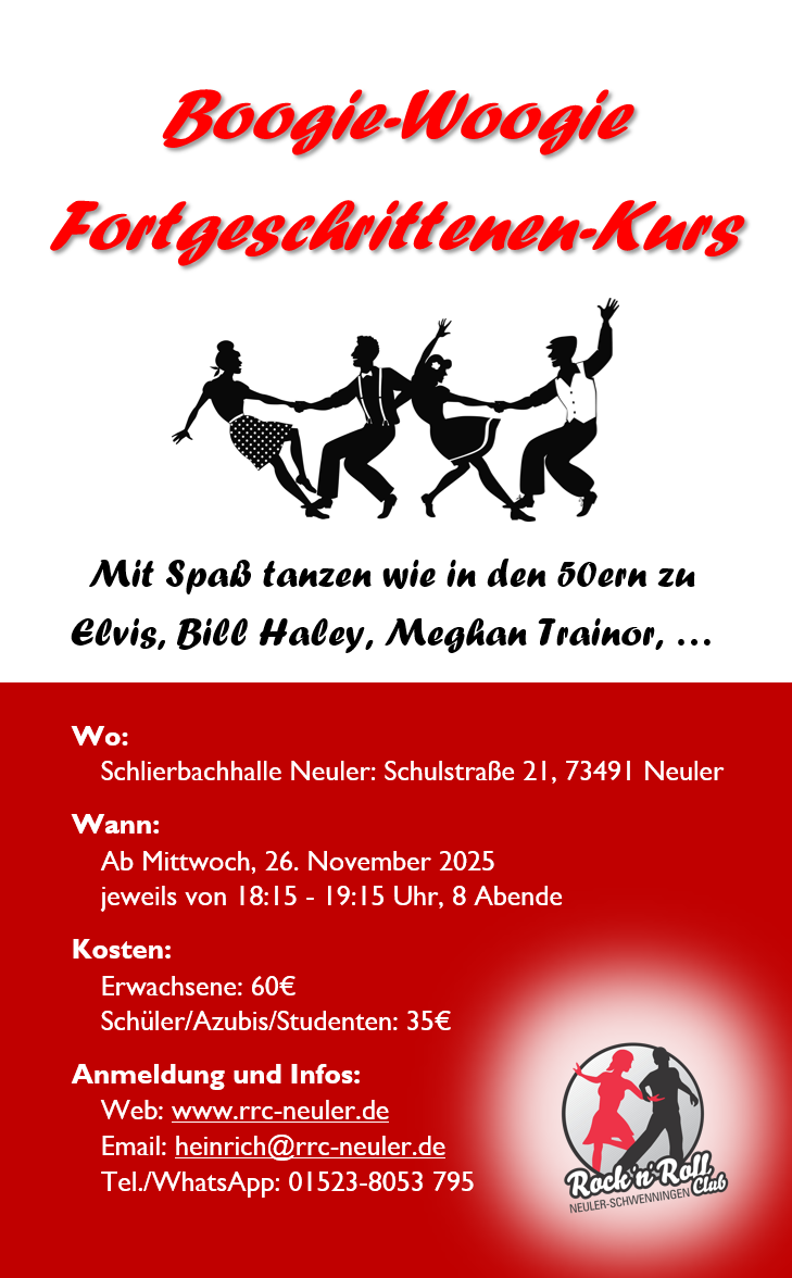 Du hast schon einen Einsteiger-Kurs absolviert? Deinen Beine wissen, wie der 6er oder 8er-Grundschritt funktioniert und Du kommst mit Basic-Figuren wie z.B. Platzwechsel, Promenade und Spins zurecht? Dich hat das Boogie-Fieber gepackt und Du willst mehr? Dann komm’ zum Boogie Woogie – Fortgeschrittenen-Kurs des Rock’n’Roll Club Neuler-Schwenningen!