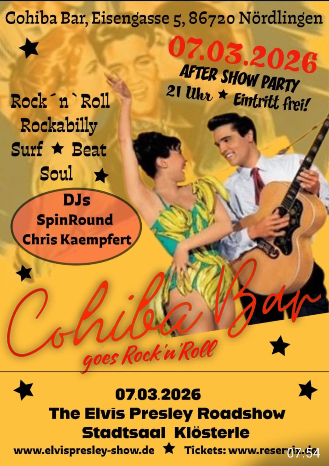 The Elvis Presley Show & After-Show-Party – Nördlingen + zum Google Calendar hinzufügen + zu iCal exportieren Die Veranstaltung ist im Gange. Datum 07 März 2026 Ongoing... Uhrzeit 19:00 - 23:30 Kategorien Boogie Woogie Partys & Feste Rock'n'Roll Diese Veranstaltung teilen